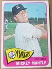 The 1965 Topps Mickey Mantle card features a sharp portrait of The Mick in his Yankees cap, set against a bold dark pink background with a bright yellow Yankees pennant in the corner — a standout layout from one of Topps’ best 1960s designs.