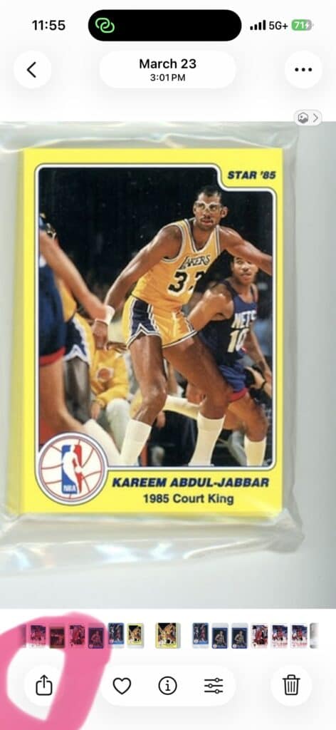 Nowadays, identifying a card is easier than ever — just use your phone. On iPhone, tap the photo, then tap the little box with an arrow in the bottom-left corner to search Google or eBay visually. On Android, use Google Lens. In almost every case, the card will be identified correctly, including the year, set, and player — giving you exactly what you need to look up its value.