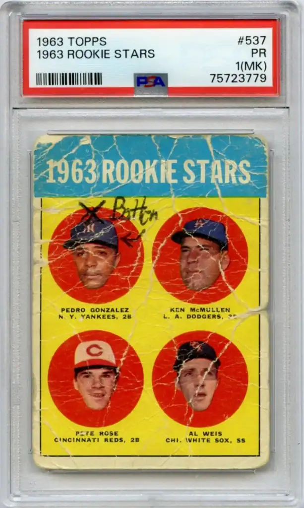 As an example, this 1963 Topps Pete Rose card is clearly in rough shape and at auction sold for less than $400, when a typical Rose Rookie card in mid grade sells for multiple thousands.