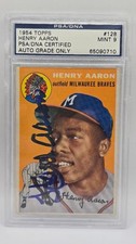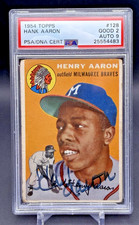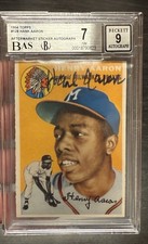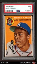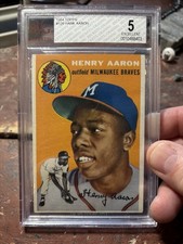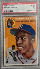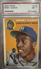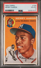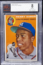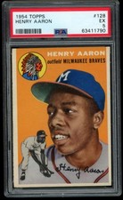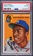 With the unfortunate passing of baseball great Hank Aaron, there has been a lot of buying activity with his 1954 Topps rookie card. The 1954 Topps baseball set is notorious for its brightly colored backgrounds, with the in-action photo of the player in the corner and a full-size portrait image of the player. The card has white borders on the left, right, and bottom of the card. Note how the orange background extends to the top of the card. Be careful when buying 54 Topps Aaron rookie cards, as there are a ton of fakes out there. Be sure to see our guide on authenticating Aaron rookie cards.