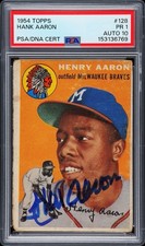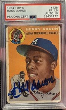 With the unfortunate passing of baseball great Hank Aaron, there has been a lot of buying activity with his 1954 Topps rookie card. The 1954 Topps baseball set is notorious for its brightly colored backgrounds, with the in-action photo of the player in the corner and a full-size portrait image of the player.  The card has white borders on the left, right, and bottom of the card. Note how the orange background extends to the top of the card. Be careful when buying 54 Topps Aaron rookie cards, as there are a ton of fakes out there. Be sure to see our guide on authenticating Aaron rookie cards.