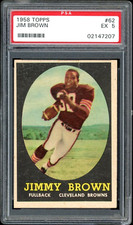 Jim Brown’s official rookie card is his 1958 Topps #62 card, one of the hobby’s most valuable football cards. On average, a mint copy of the card (PSA 9) is worth between $300,000 to $350,000. PSA has not graded any PSA 10 (Gem Mint) copies of Brown’s rookie card. See our article for more info on Jim Brown’s Rookie Card.