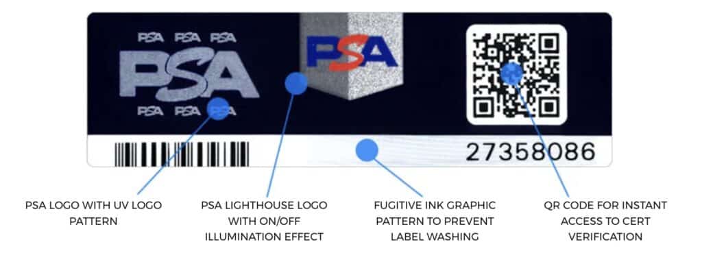 The company’s trademark blue still spans the back of the label. While, a large, centered PSA Lighthouse logo is flanked by a stylized “PSA” (in lieu of “Professional Sports Authenticator”) and a QR code. Tamper-evident fugitive ink graces the area below the blue background.