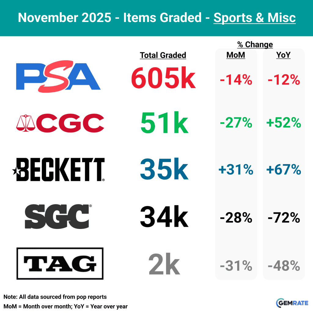 Even more surprising is that Beckett’s position had stabilized, with its total cards graded eclipsing SGC’s in November, leapfrogging SGC into third position overall for graded sports cards.