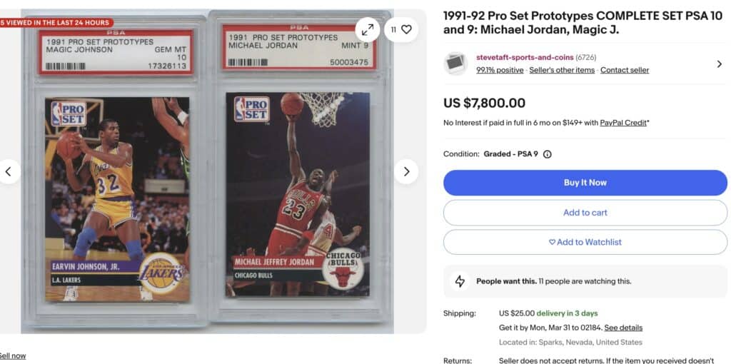 Given the scarcity, it’s hard to get a completely accurate gauge of value, but for the non-Jordan or Magic cards, the value ranges from $250 to $500 for PSA 9 to PSA 10 copies.