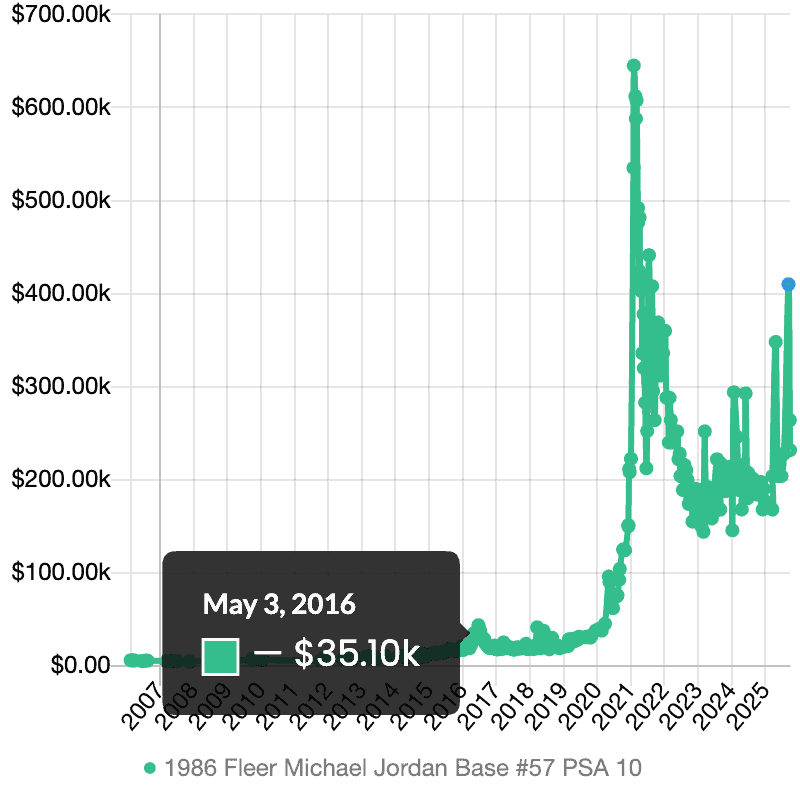 At the peak in 2021, a Gem-Mint Jordan Fleer rookie shattered records, selling for $738,000. Since that sale, the value of a PSA 10 Fleer Jordan has fallen by a mind-boggling 78%. It might take a very long time for that buyer to get back to even.