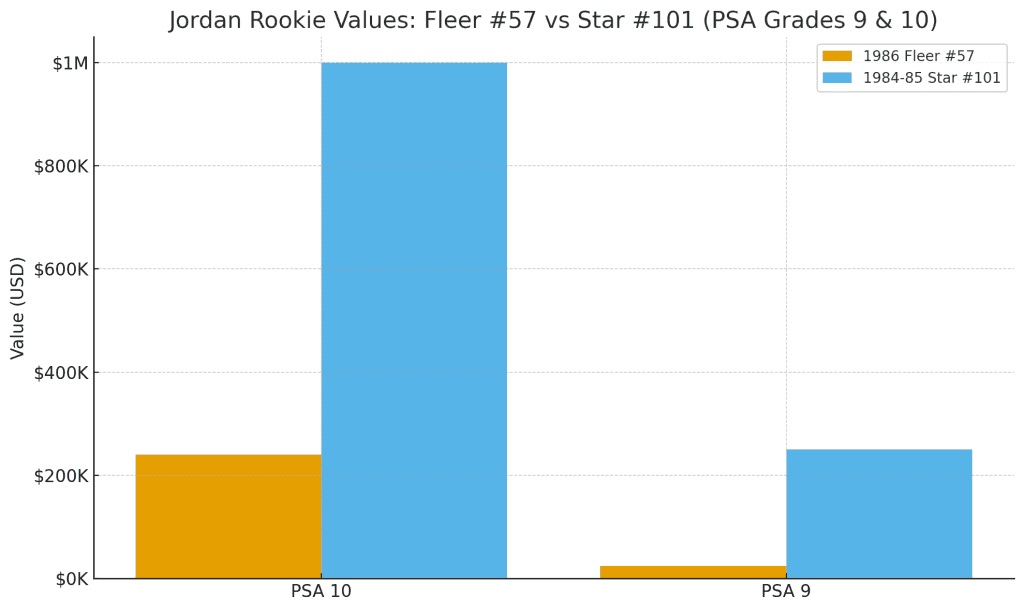 The Star #101 Jordan in PSA 9 now sells for 4× the price of a Fleer PSA 10, and over 40× the price of a PSA 9 Fleer rookie.
