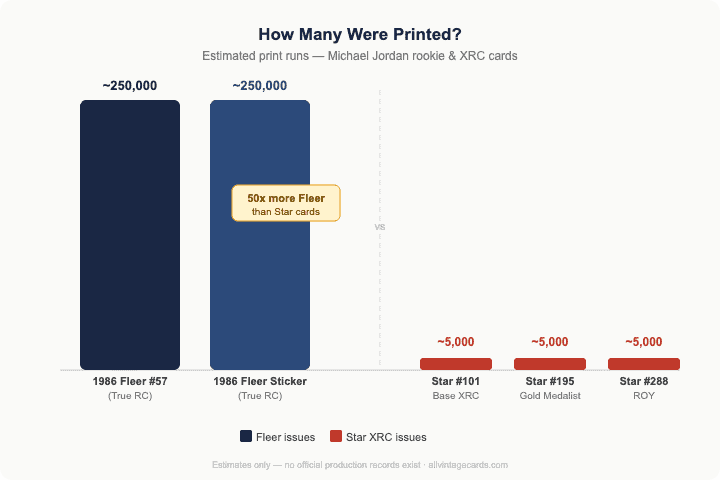 The picture that emerges is that Jordan’s Star XRC issues were produced in far fewer quantities than the Fleer Rookie Card (estimated at 5,000 cards per set).